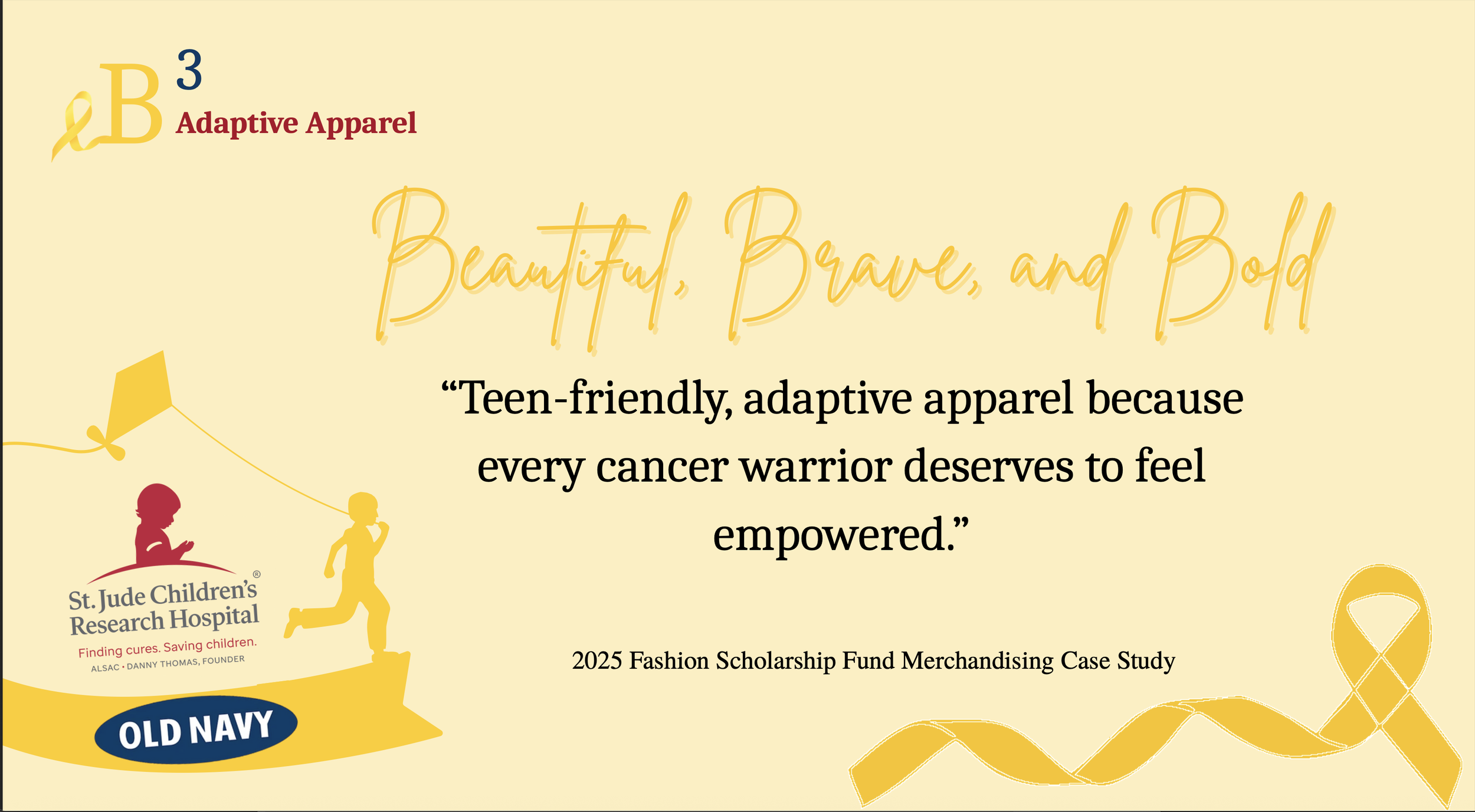 I proposed a collaboration between Old Navy and St. Jude Children's Research Hospital to launch “Beautiful, Brave, Bold”, the first affordable adaptive apparel line designed specifically for teens undergoing cancer treatment.
